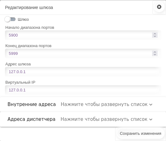 Шлюз подключений внешних пользователей не подразумевает отдельной конфигурации пользователем. При вводе настроек на диспетчере настройки шлюзов применяются автоматически. Ранее добавленные шлюзы выключаются. Если в процессе конфигурации шлюза допущена ошибка, то он выключается, а ранее добавленный - включается, при этом диспетчер применяет верную конфигурацию.