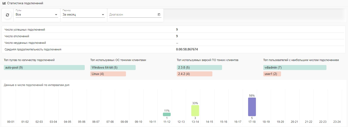В данном разделе представлена статистика подключений пользователя (тонкого клиента) к пулам виртуальных машин Space Disp.