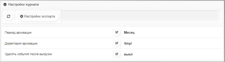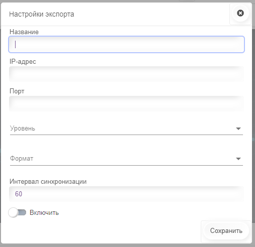 Для настройки выгрузки во внешнюю систему журналирования необходимо нажать кнопку Настройки экспорта и заполнить следующие поля: