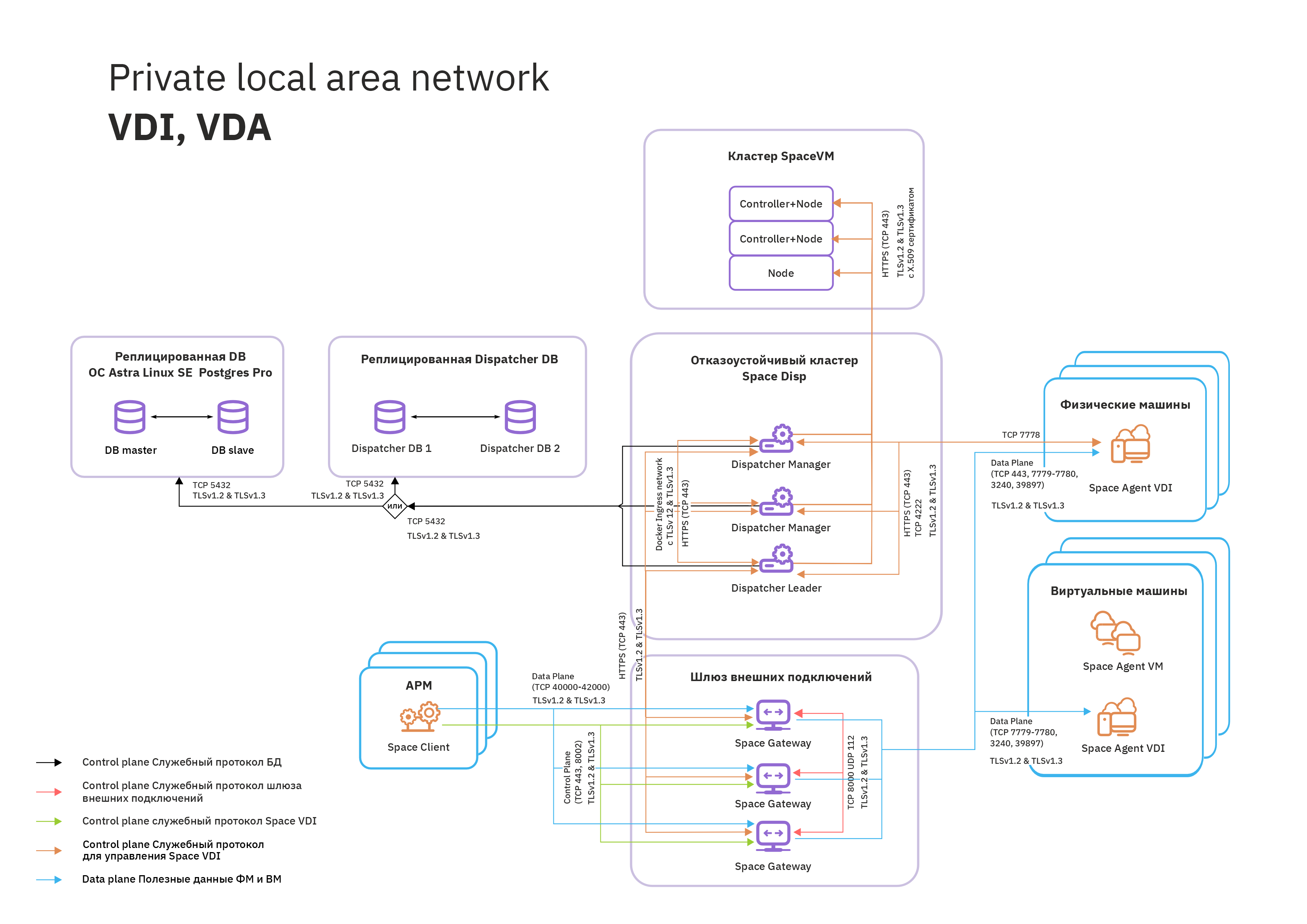 Ниже представлена архитектурная схема, отображающая взаимодействие всех компонентов системы с указанием шифрования трафика, типов портов и протоколов, доступность которых необходима для корректной работы Space VDI.