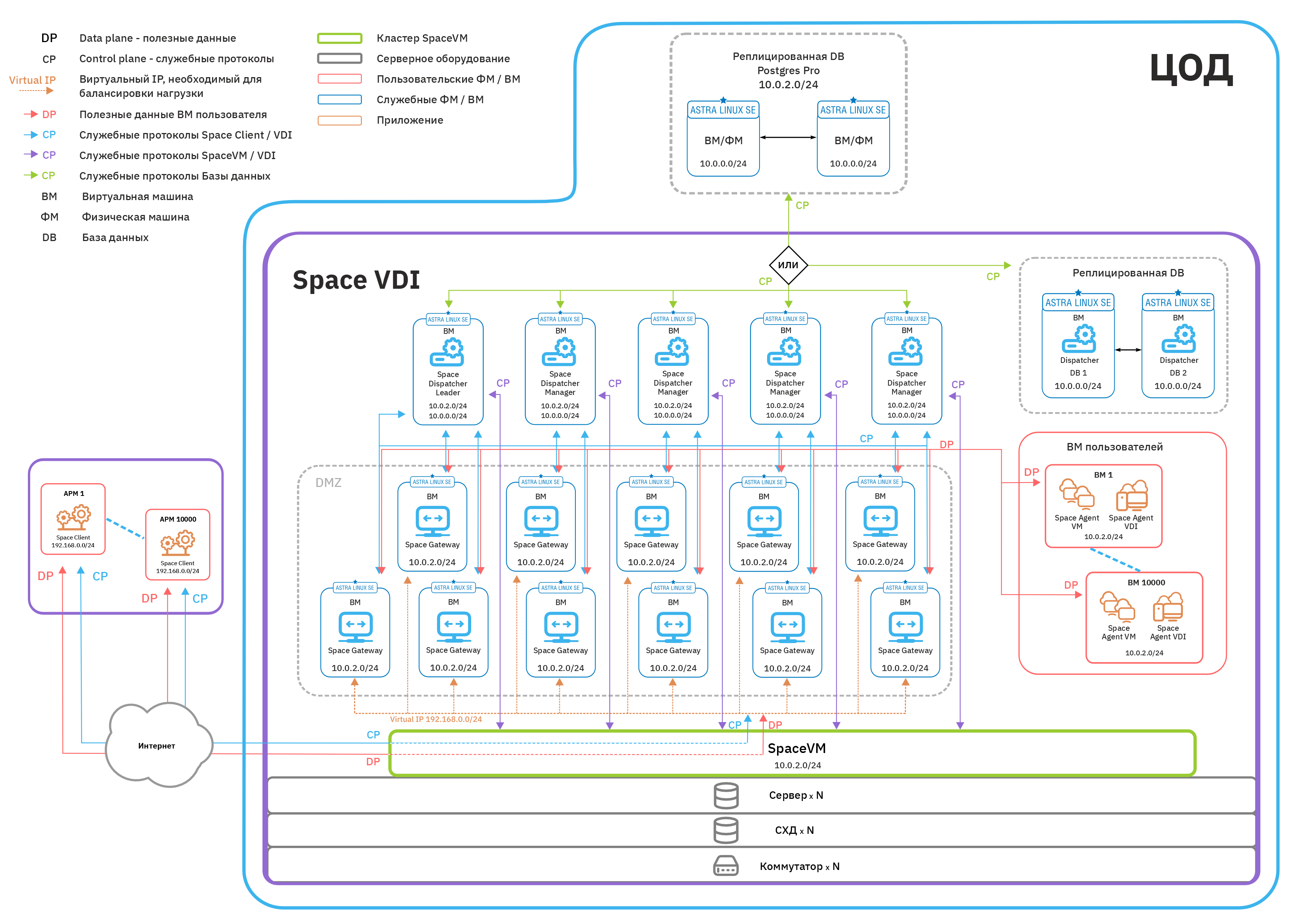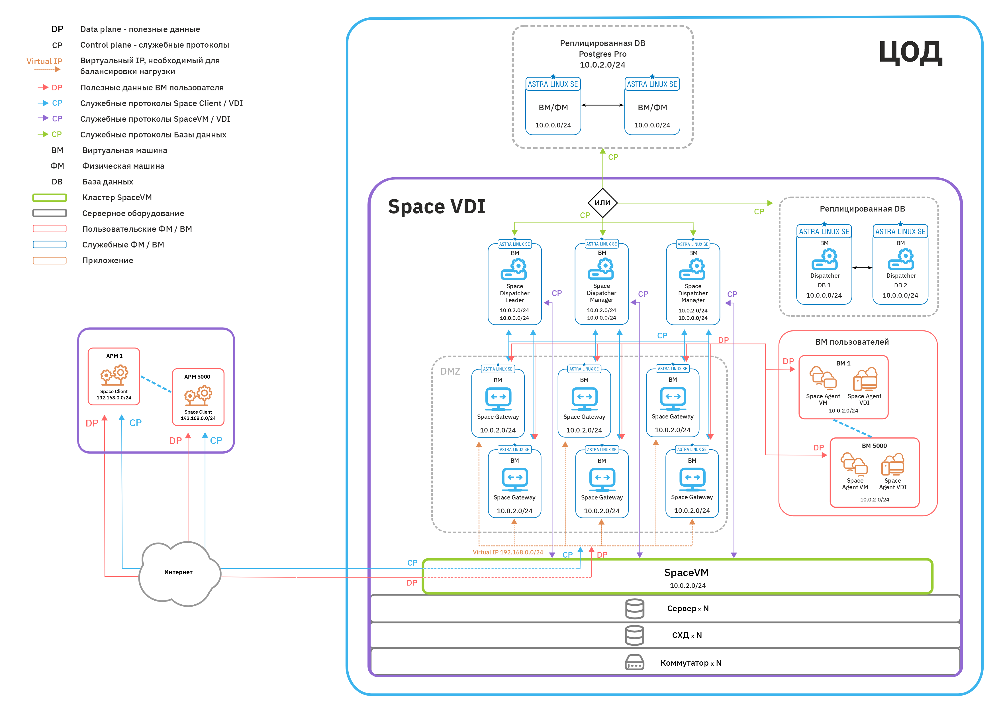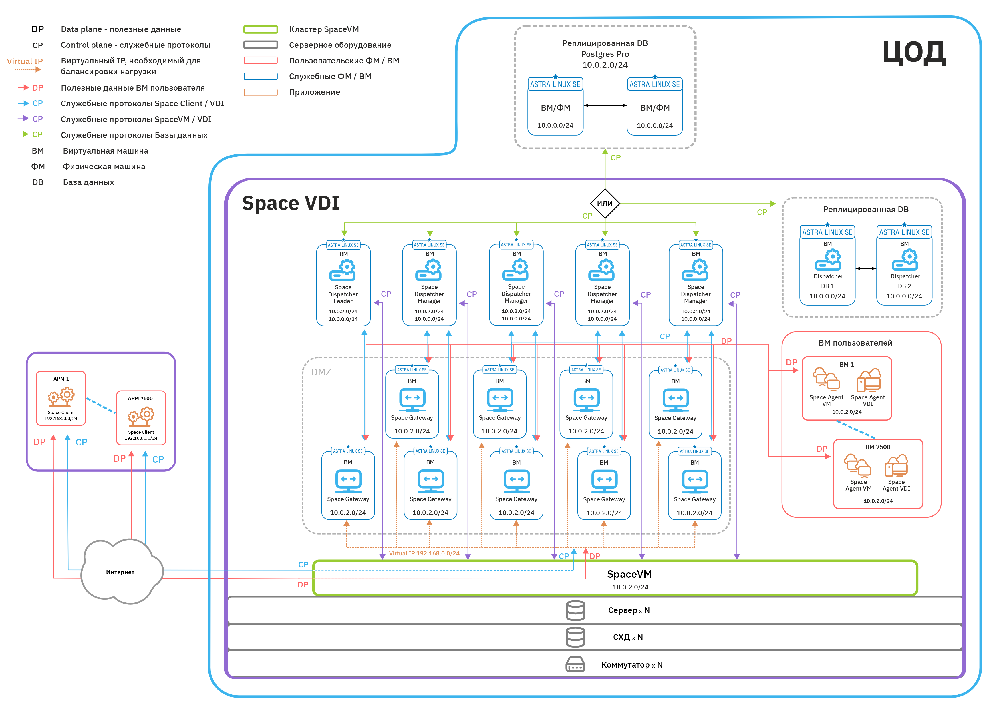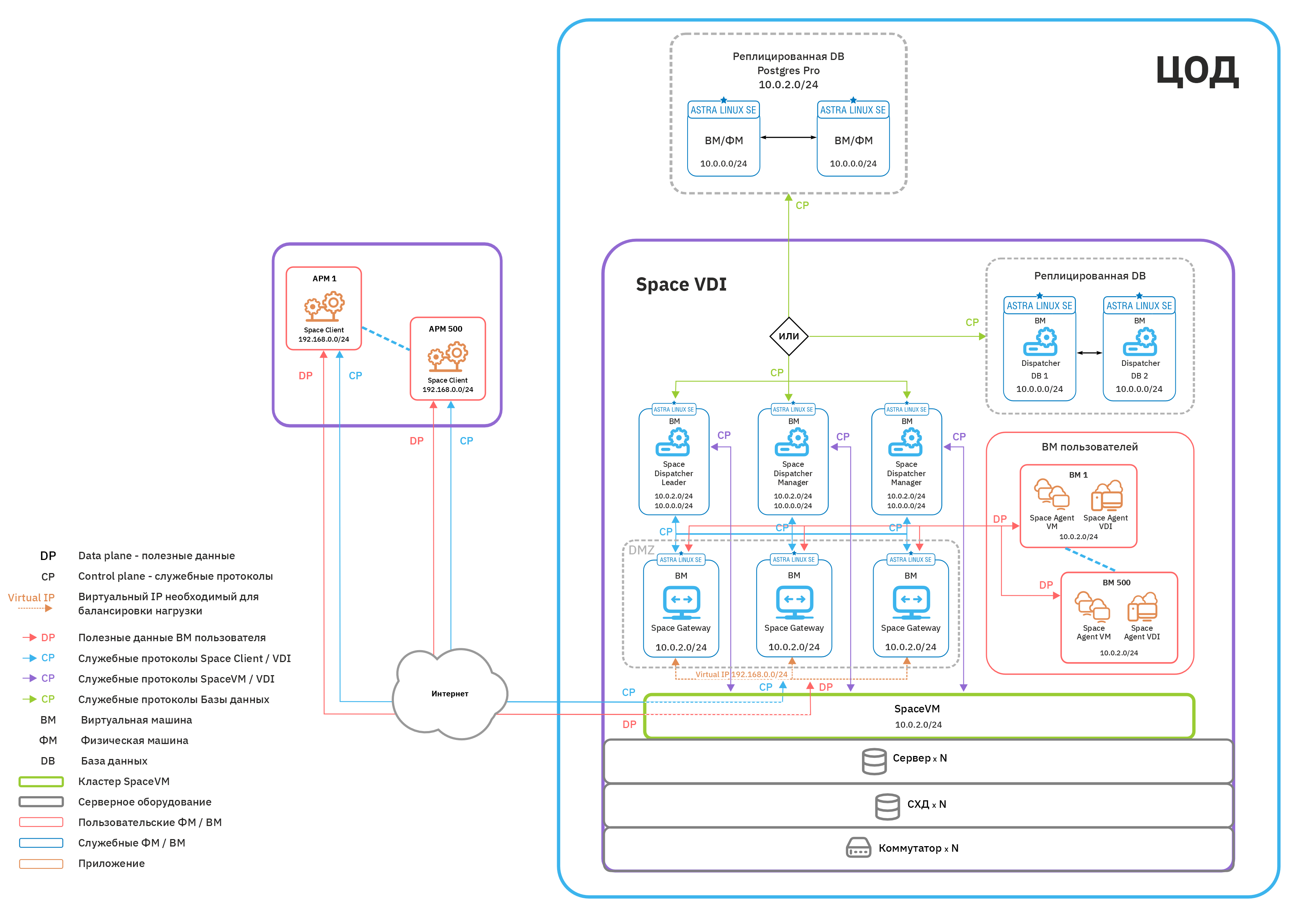 - Компоненты внутри ЦОД находятся в подсети (10.0.2.0/24), объединены в единое логическое пространство: SpaceVM.