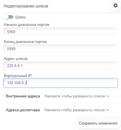 В настройках диспетчера для полей Адрес шлюза и Виртуальный IP указывается одинаковый адрес.