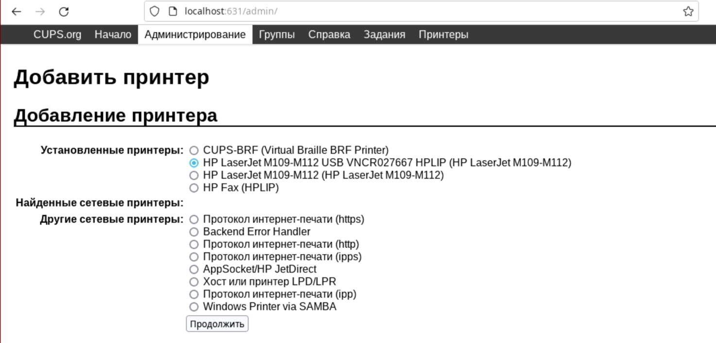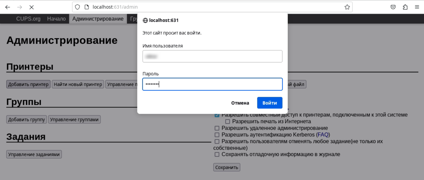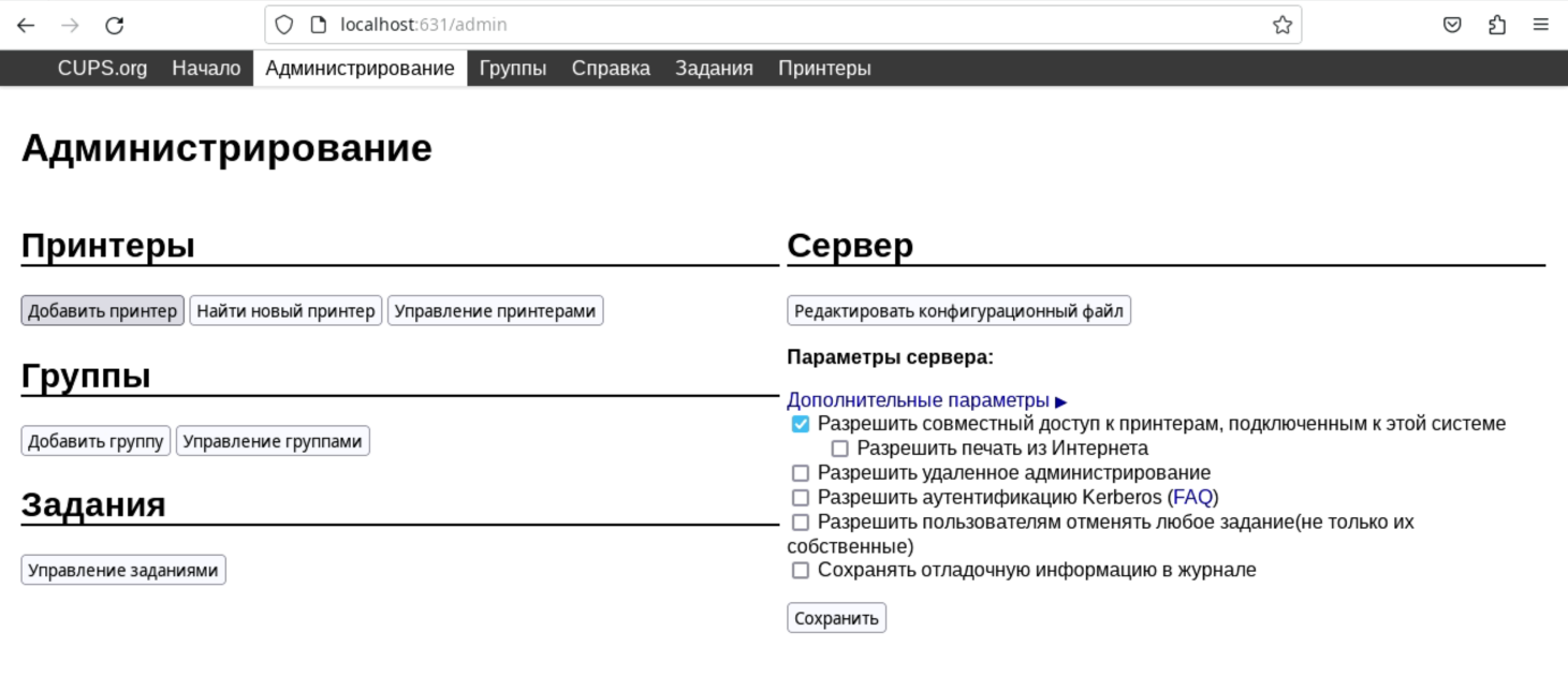 Открыть браузер и перейти в управление CUPS, ввести "localhost:631".