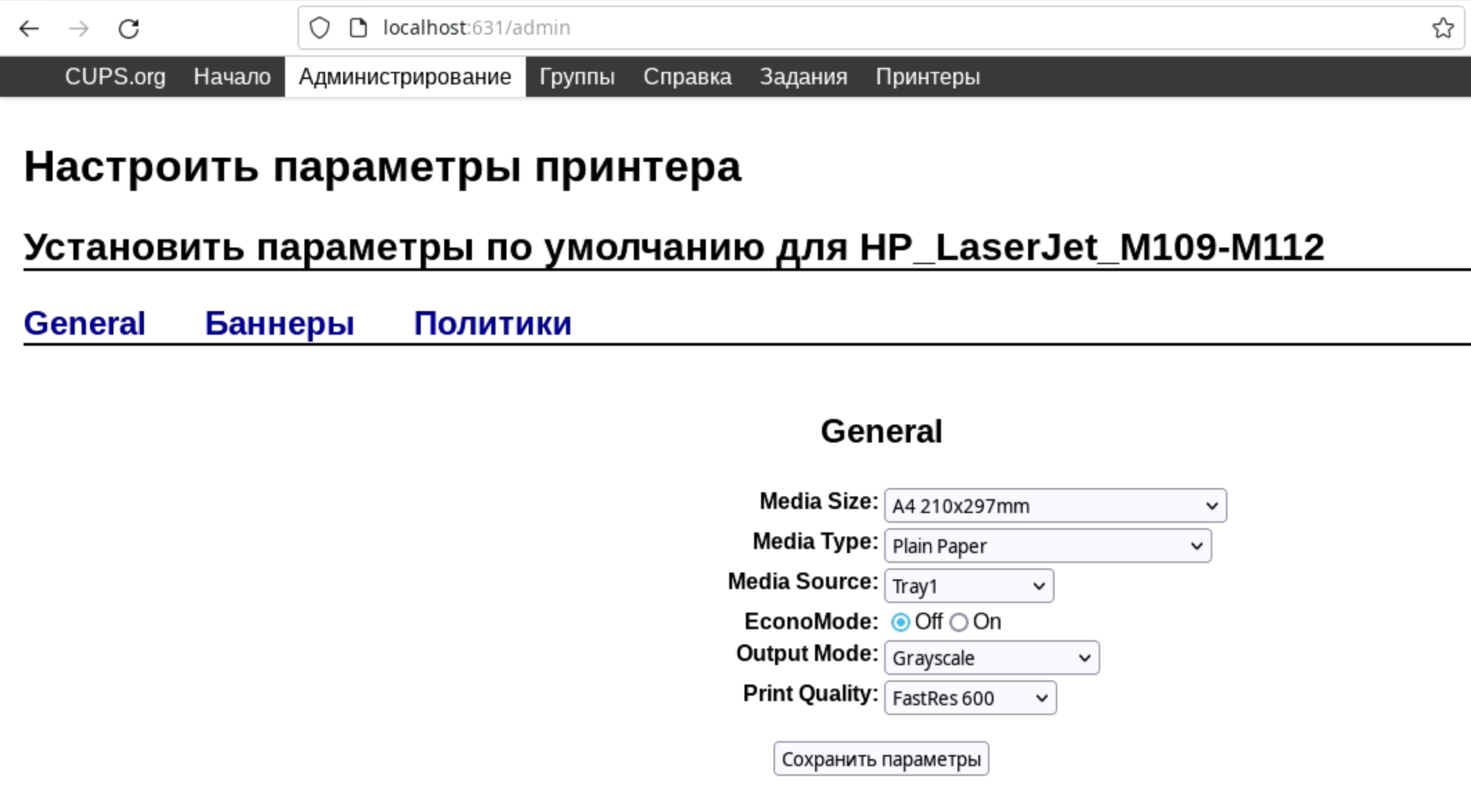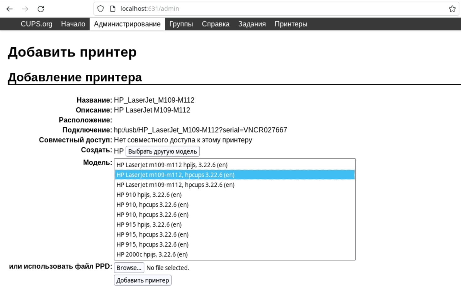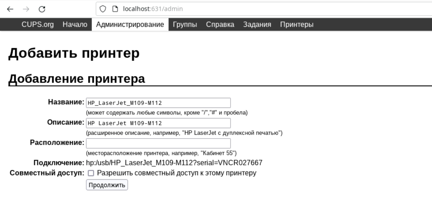 Открыть браузер и перейти в управление CUPS, ввести "localhost:631".