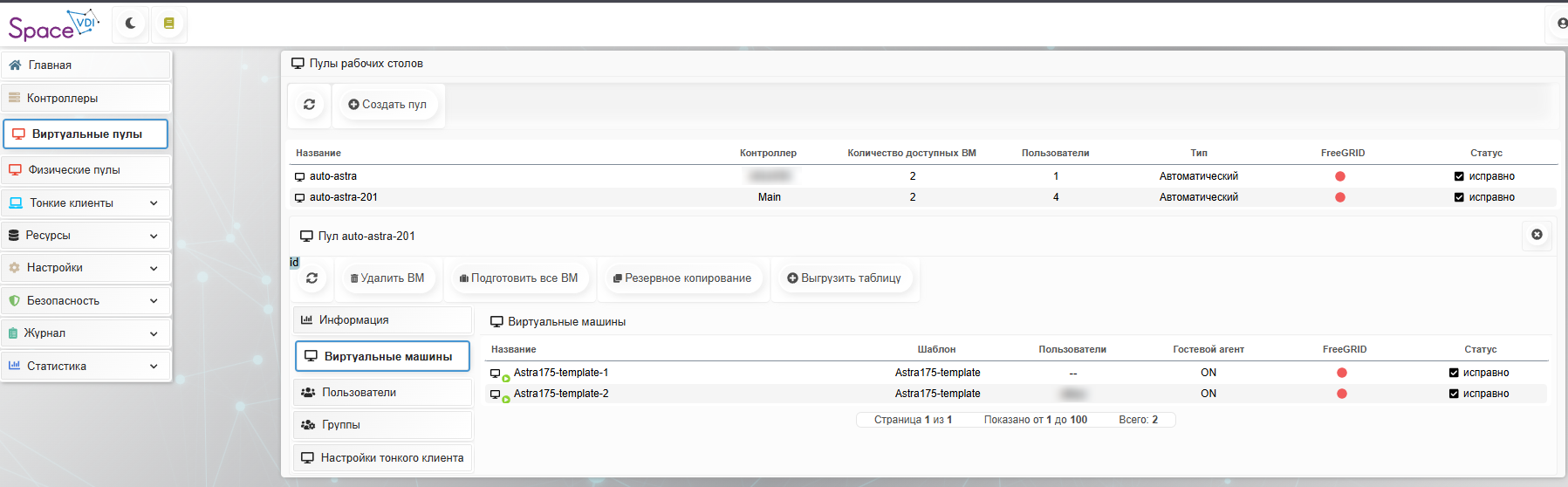 В Space Disp создать виртуальный пул с типом подключения GLINT, выбрать ранее подготовленный шаблон ВМ.