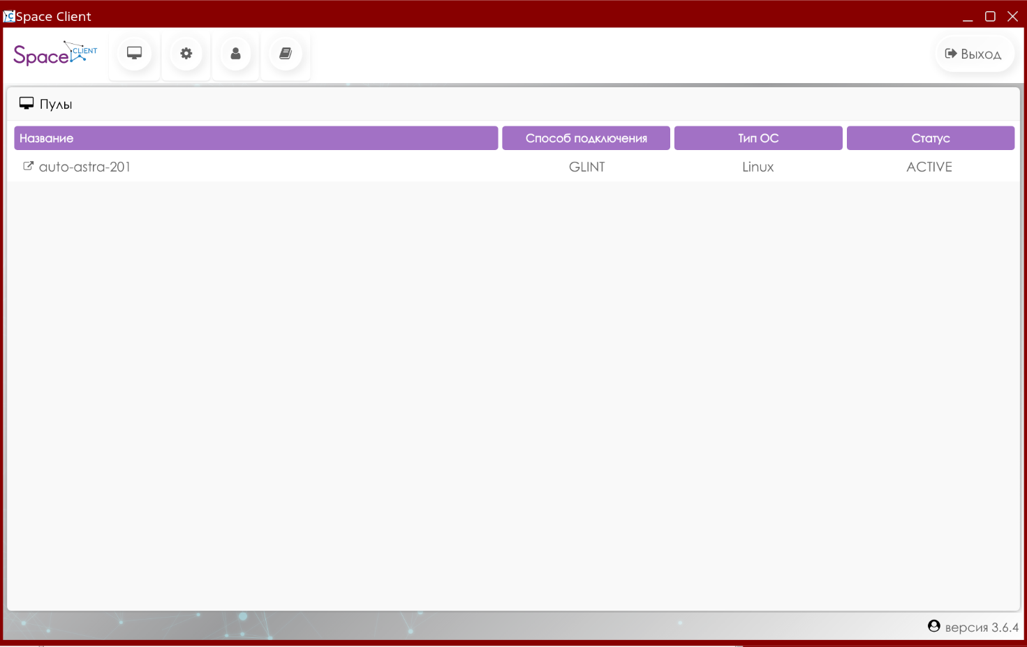 Подключиться к ВМ: для этого выбрать необходимый пул из списка и протокол подключения GLINT.