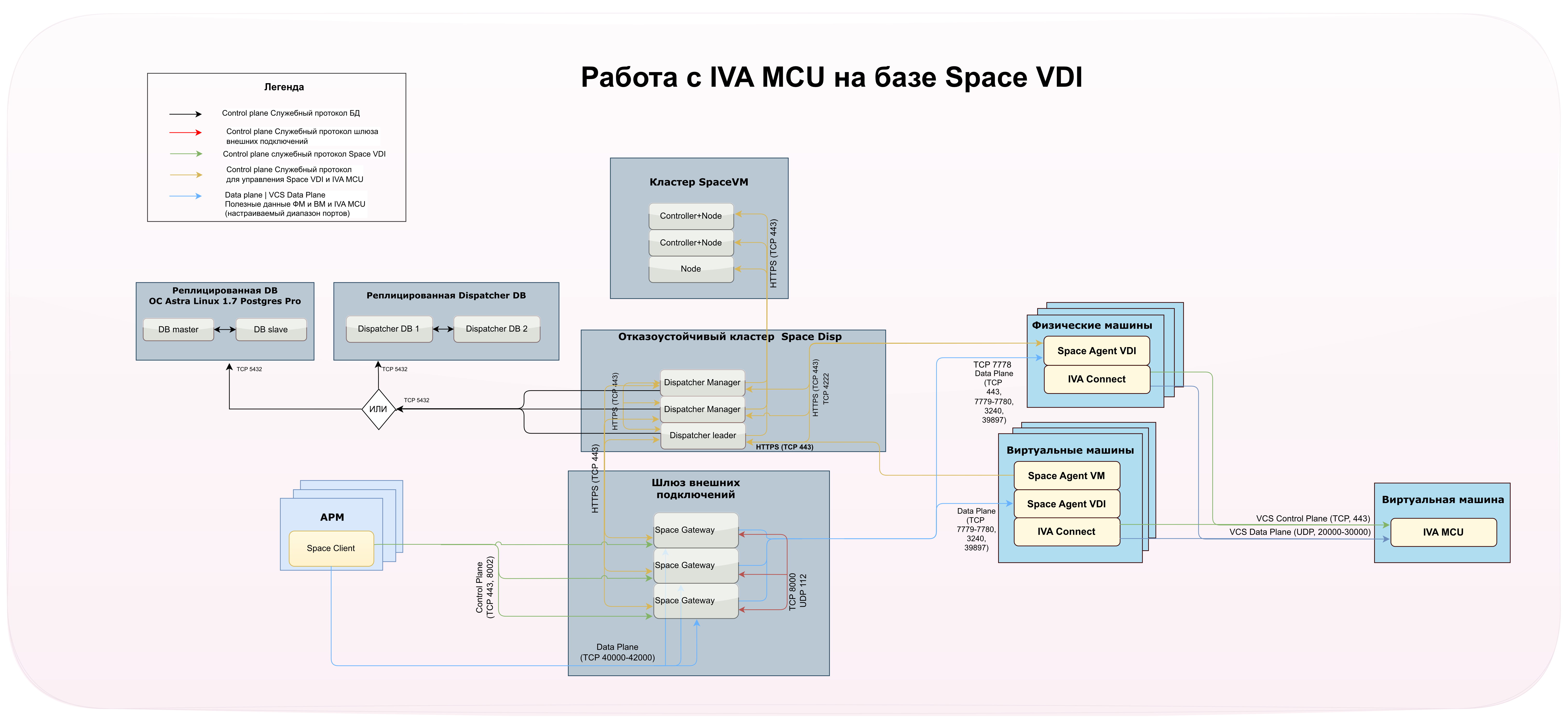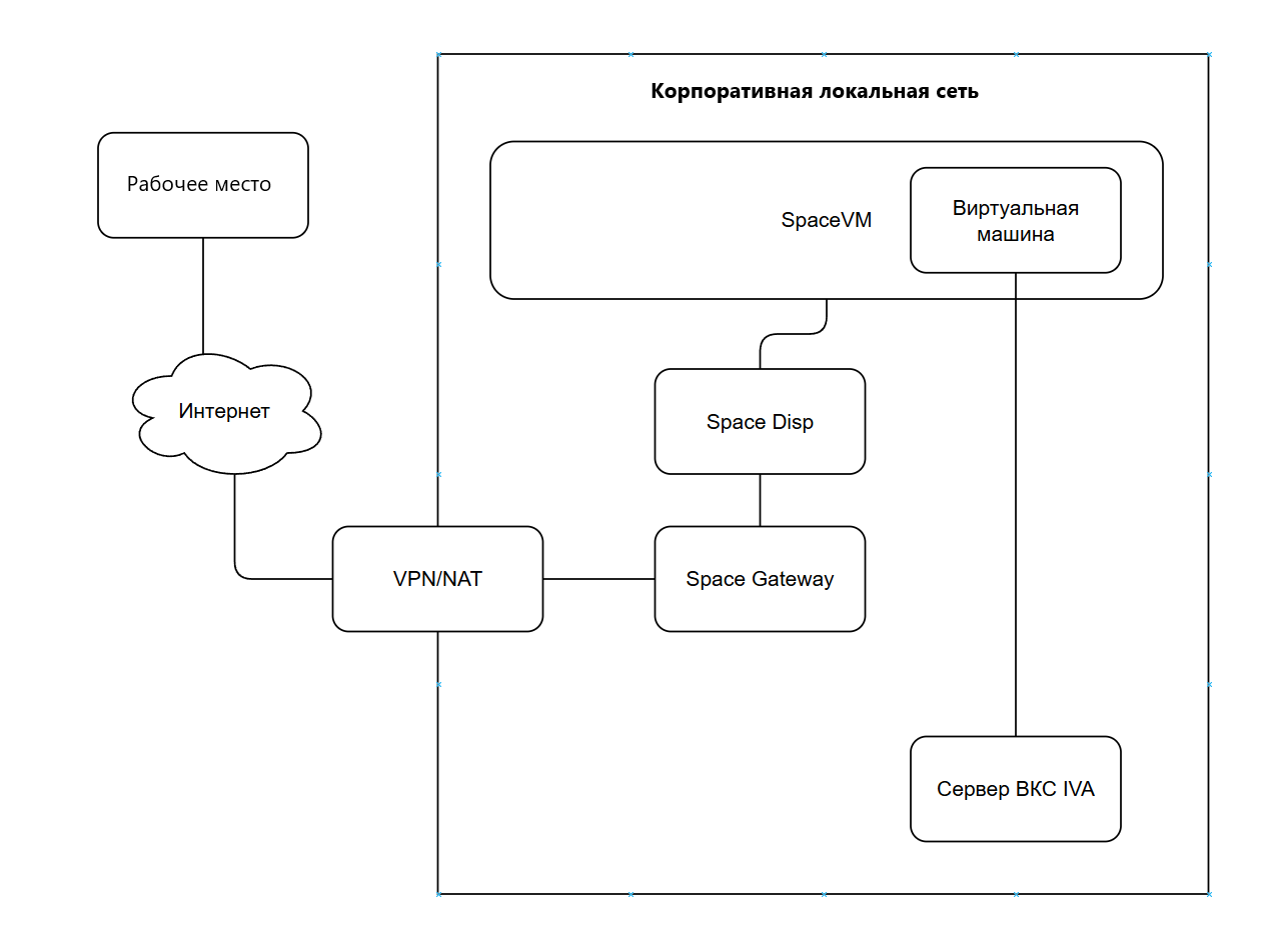 Рабочее место (Space Client) → Интернет → Шлюз (Space Gateway) → Сервер VDI (Space Disp) → Гипервизор (SpaceVM) → Виртуальная машина/Физическая машина (IVA Connect) → Cервер ВКС IVA (IVA-MCU)
