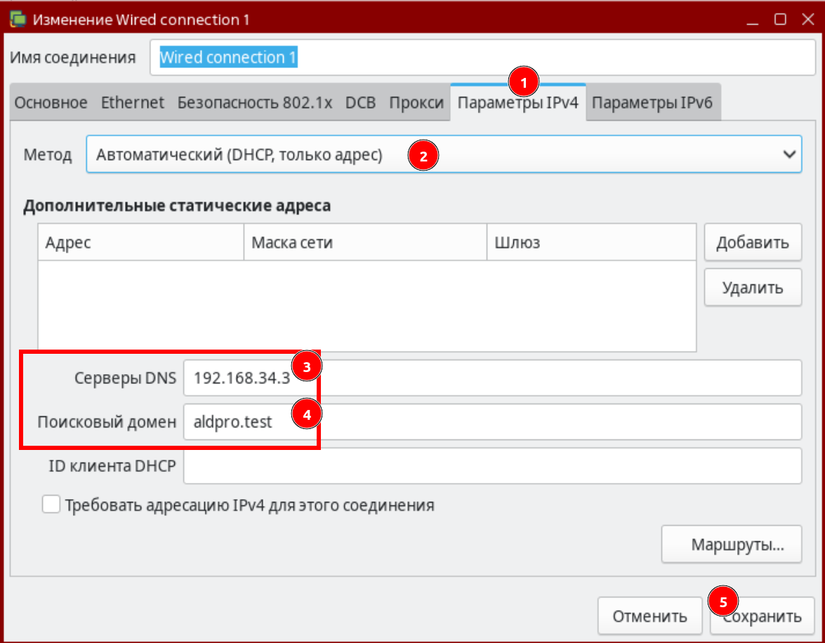 - В поле Серверы DNS указать IP-адрес сервера ALD Pro.