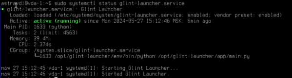 sudo systemctl status glint-launcher.serviceЕсли сервис запущен и работает корректно, состояние службы должно быть