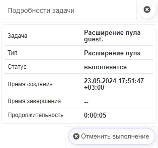 Для отмены задачи со статусом Выполняется необходимо нажать левой кнопкой "мыши" на интересующую задачу в списке и в появившемся окне нажать кнопку Отменить выполнение.